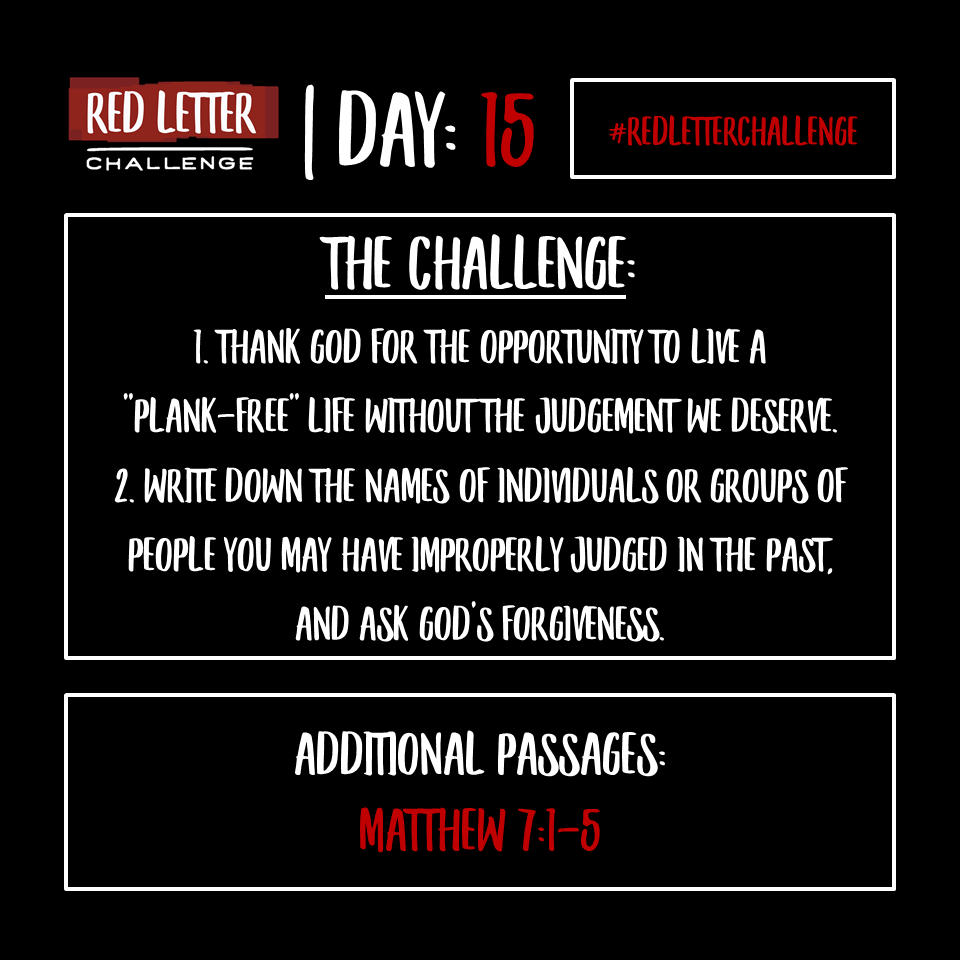 The day 15 devo asks: "Do I have a plank in my eye?" Not a question we ask every day, but a valid one to start asking ourselves.